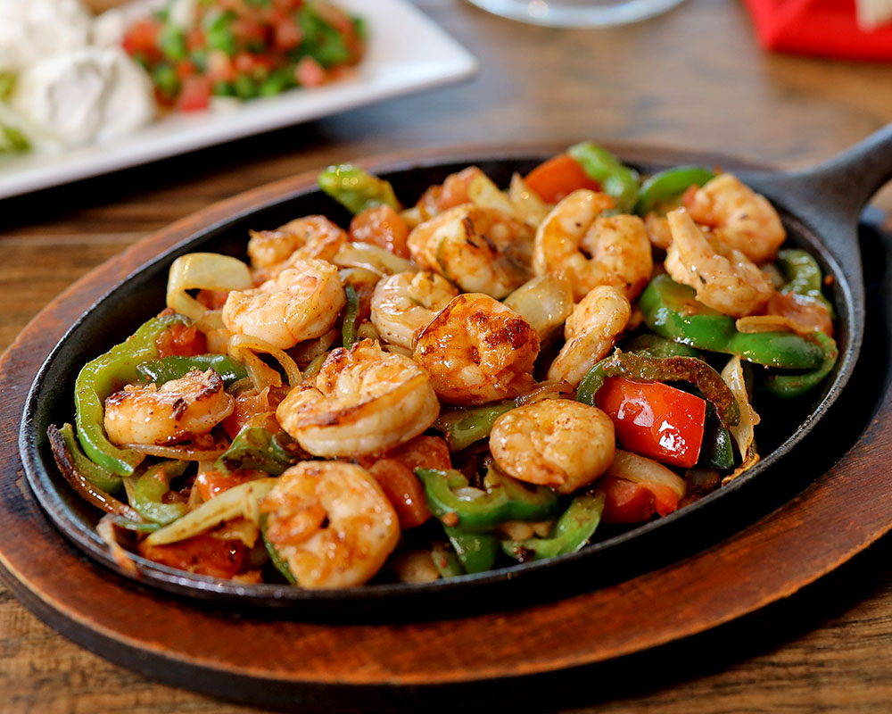 FAJITAS TEXANAS 24.99 Grilled sirloin steak strips, Grilled chicken, Grilled shrimp with bell peppers, onions and tomatoes. Served with Spanish rice, refried beans, lettuce, cheese, sour cream, pico de gallo and flour tortillas.